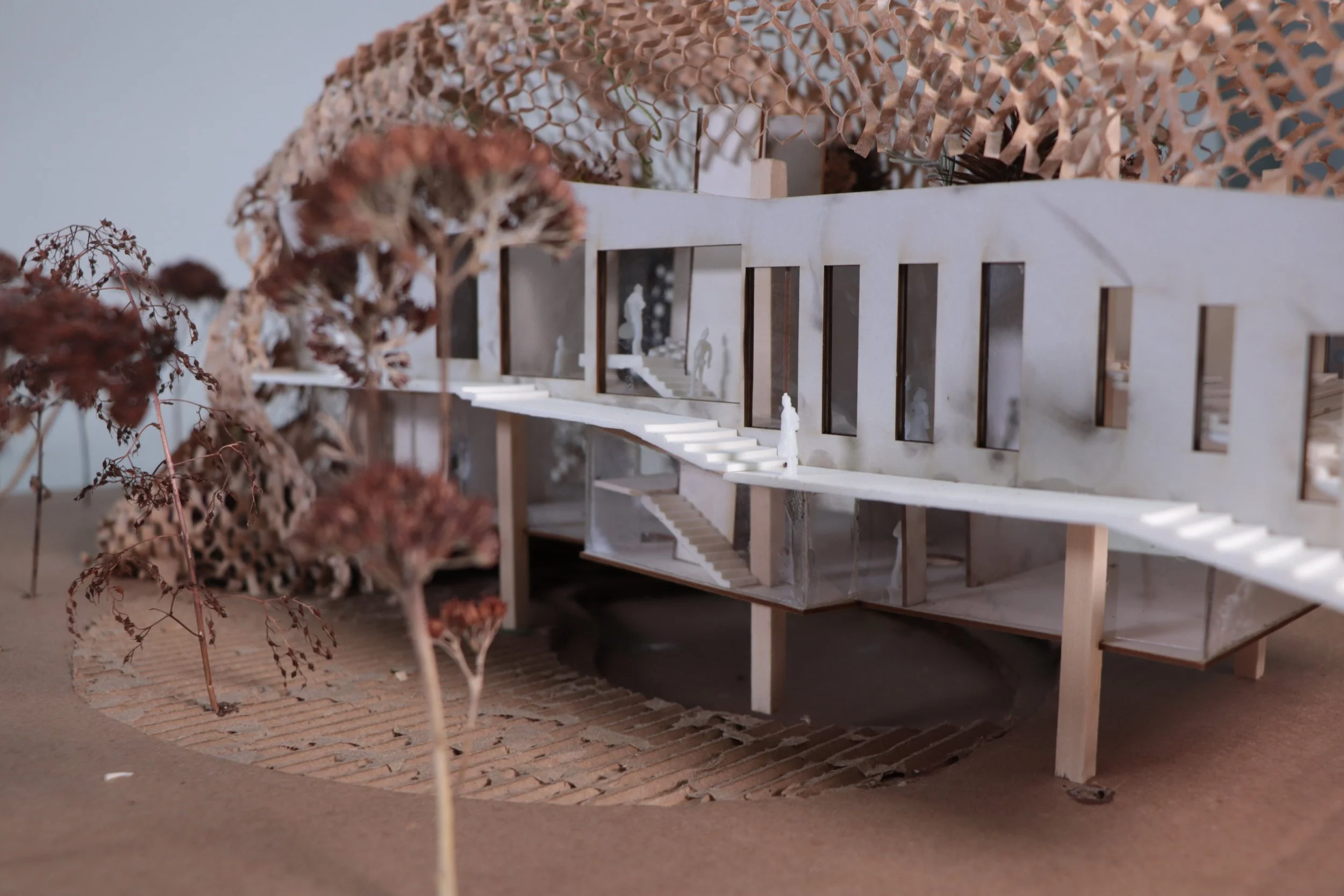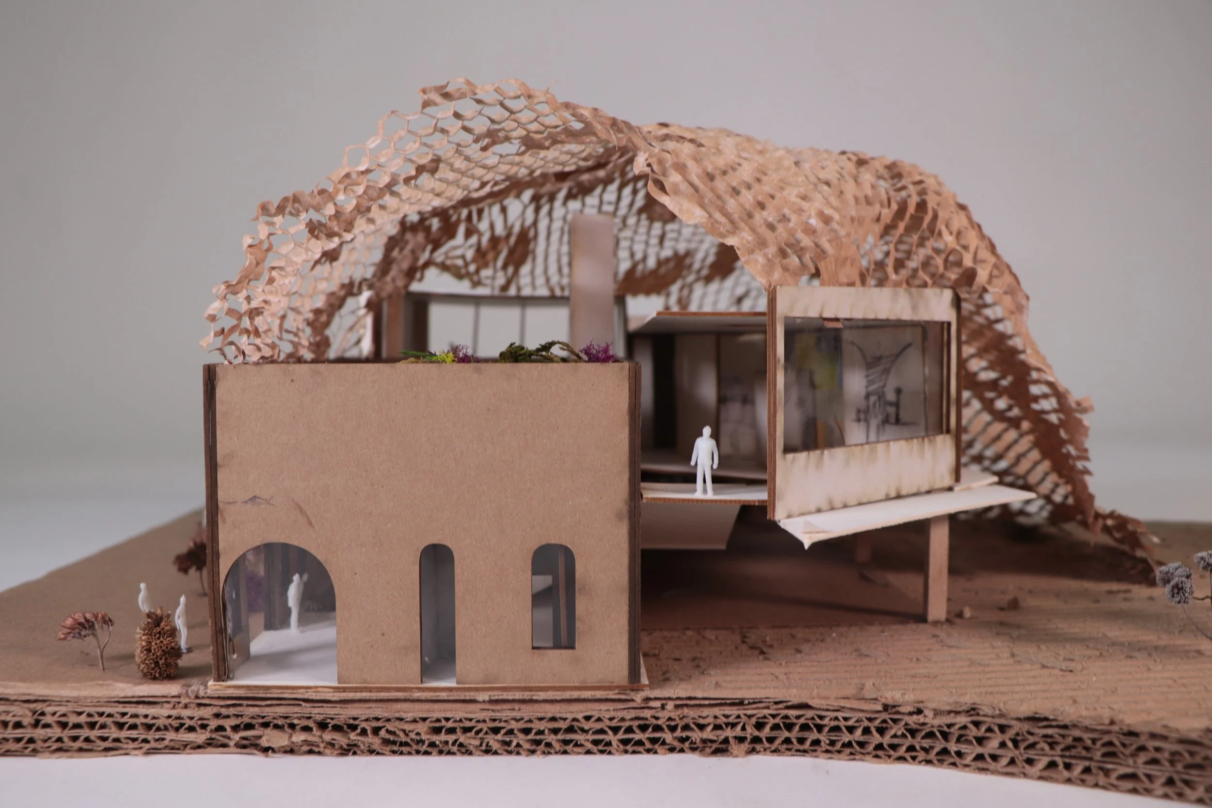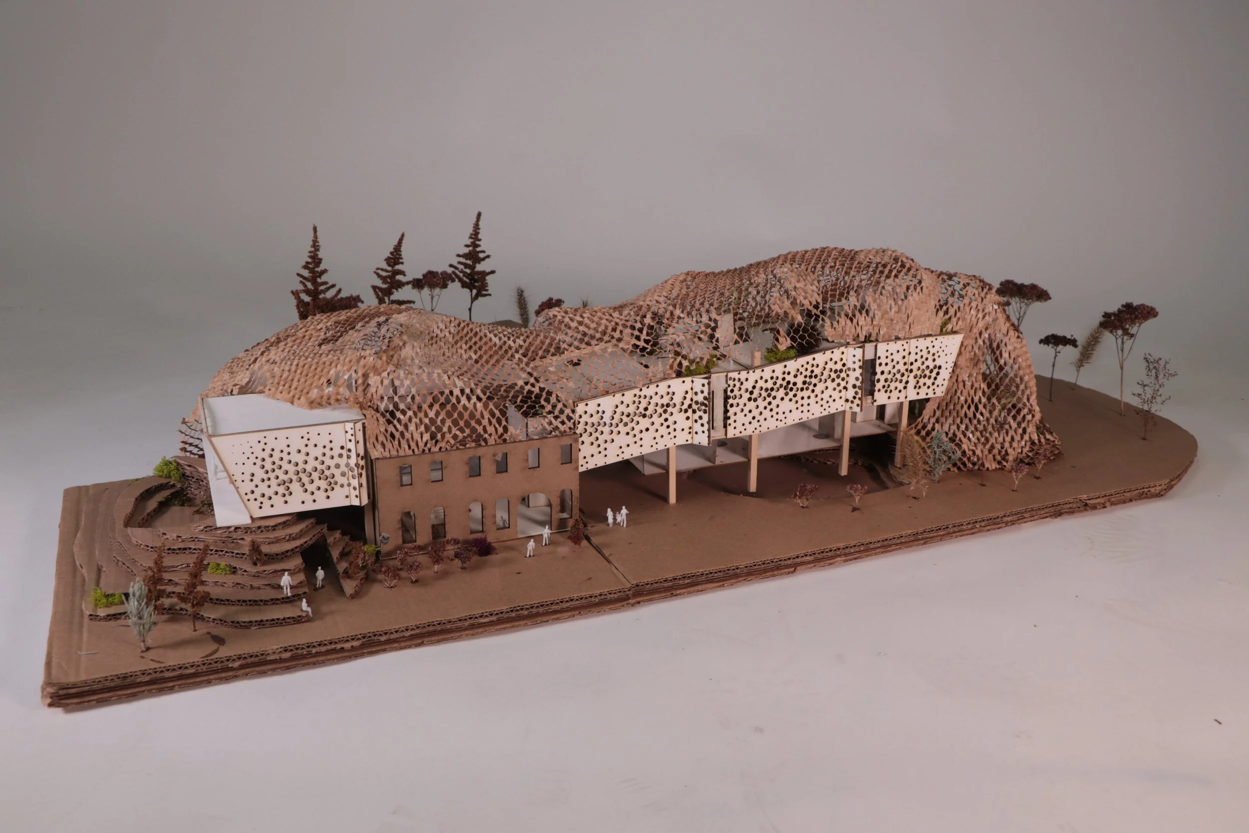 The form rises from the ground, moving linearly across space and time. The program is informed by the progression of time, left to right, and the circulation, which carves through the form to break up the linear nature. The current site was imprinted using the historical program to help lay out the program outside.